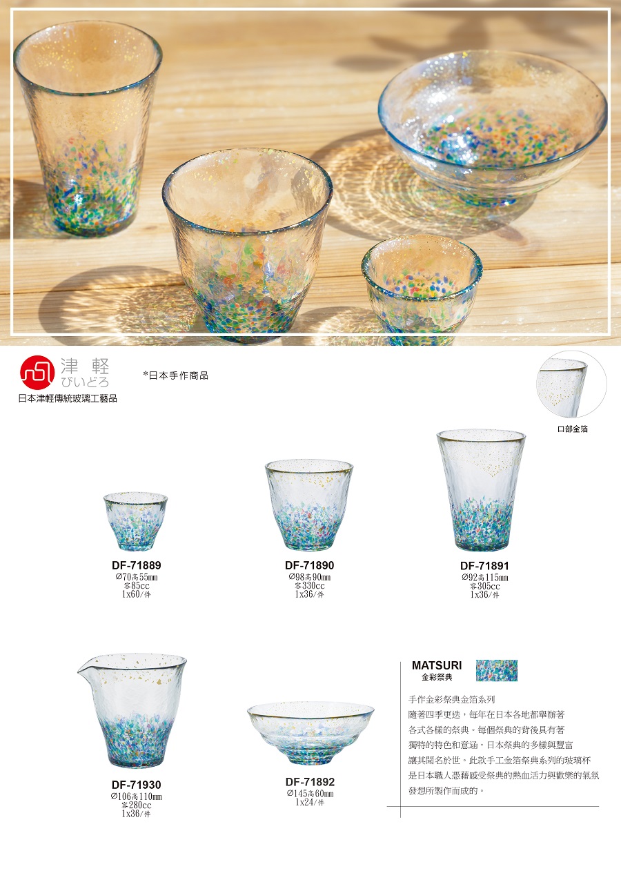 隨著四季更迭,每年在日本各地都舉辦著各式各樣的祭典。每個祭典的背後具有著獨特特色和意涵,日本祭典的多樣與豐富,讓其聞名於世。此款手工金箔祭典系列的玻璃杯,是日本職人憑藉感受祭典的熱血活力與歡樂的氣氛,發想所製作而成的。