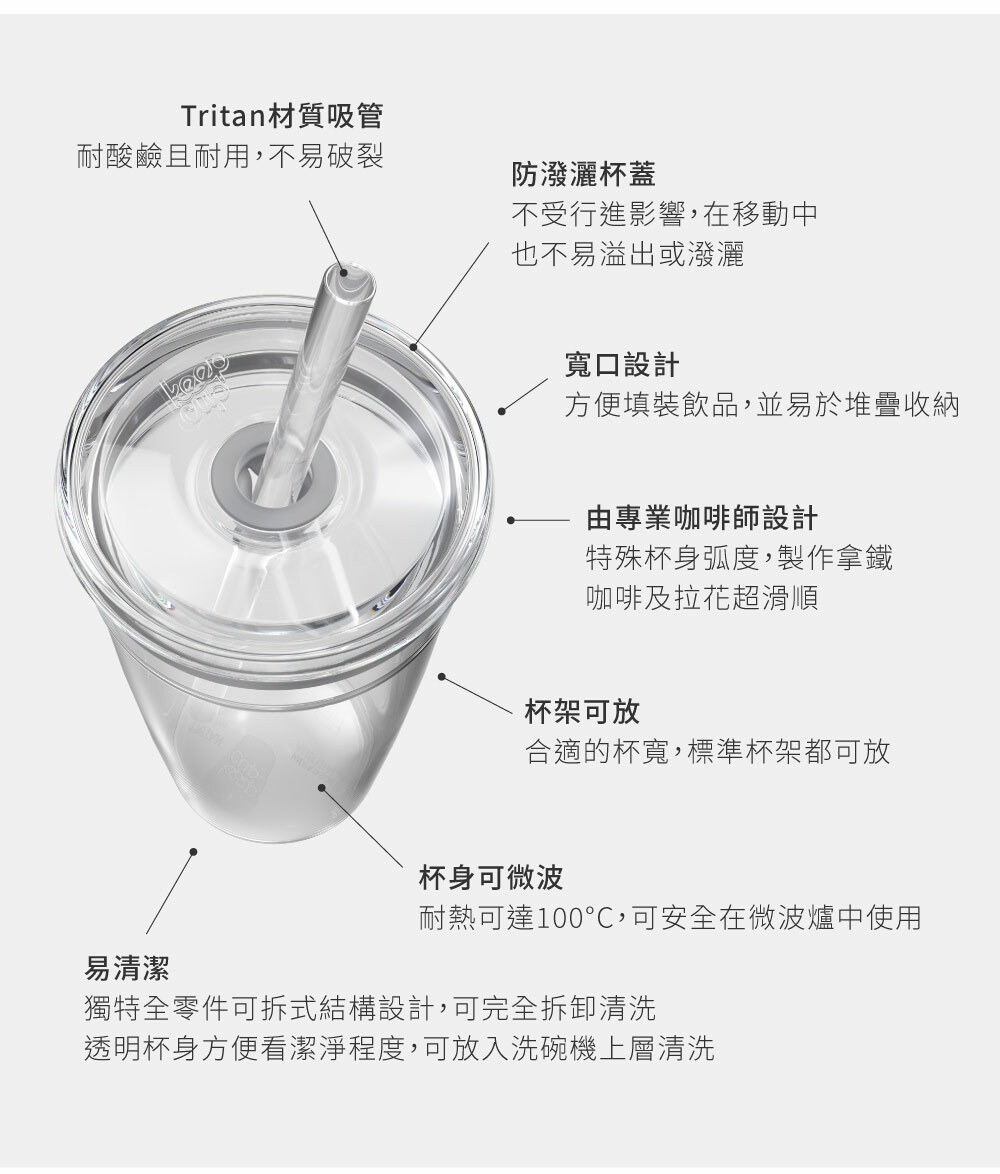 - 耐 熱:杯、蓋&吸管 100°C (建議適用於45℃以下的飲品,以避免燙手。)