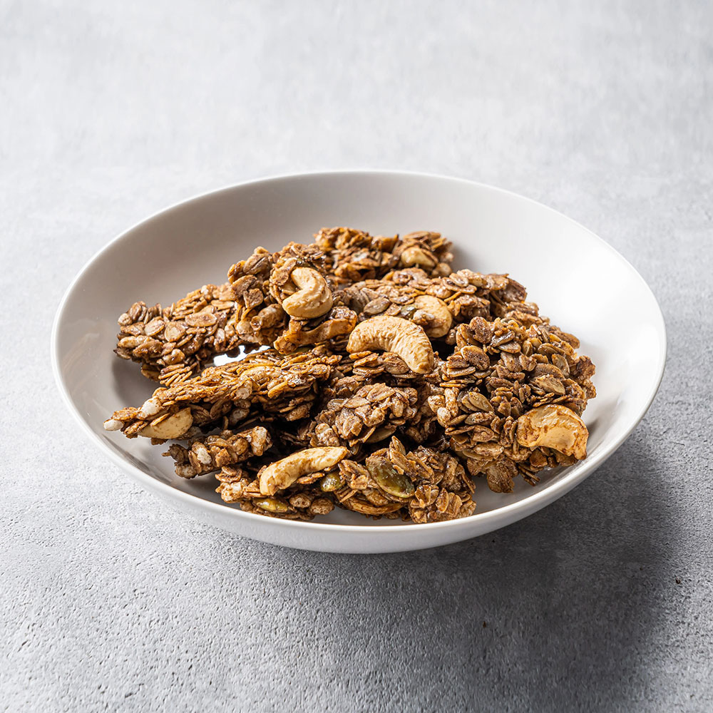 - 內 容 物:燕麥片、腰果、芥花油(非基改)、米香、蔗糖、麥芽糖(樹薯粉、水)、南瓜籽、台茶18號(紅玉)、玉米來源可溶性纖維、純黃豆粉、鹽、混合濃縮生育醇(抗氧化劑)