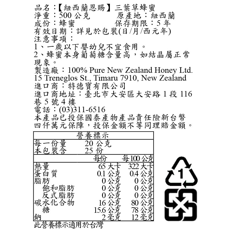 | 品名: | 【 紐西蘭恩賜】三葉草蜂蜜1瓶 |