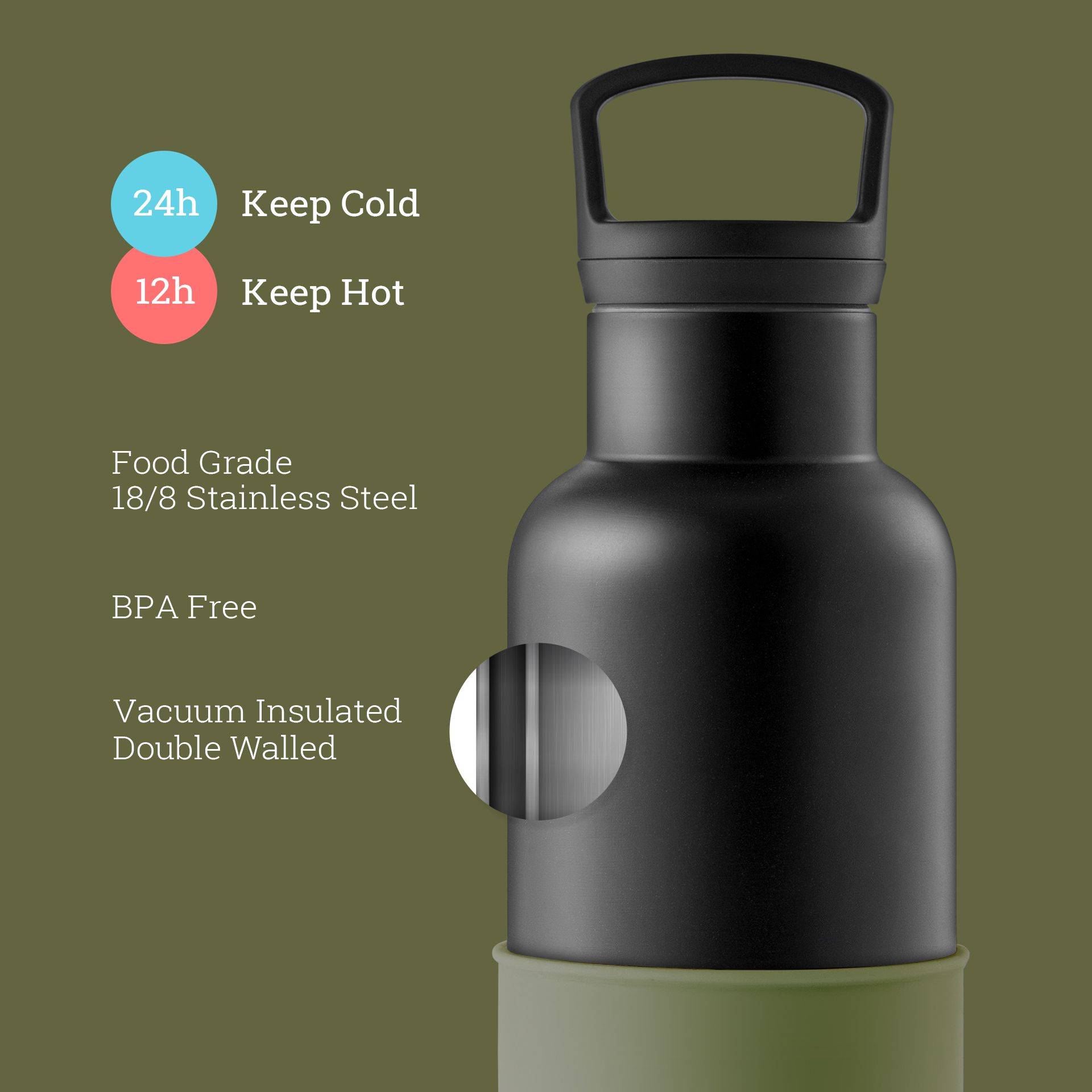 無論您在辦公室、健身房或是在戶外享受溫暖的陽光,雙層不銹鋼瓶身設計可保溫12小時、保冷24小時 ,無論甚麼樣的環境都能喝到冰涼或溫熱的飲品。