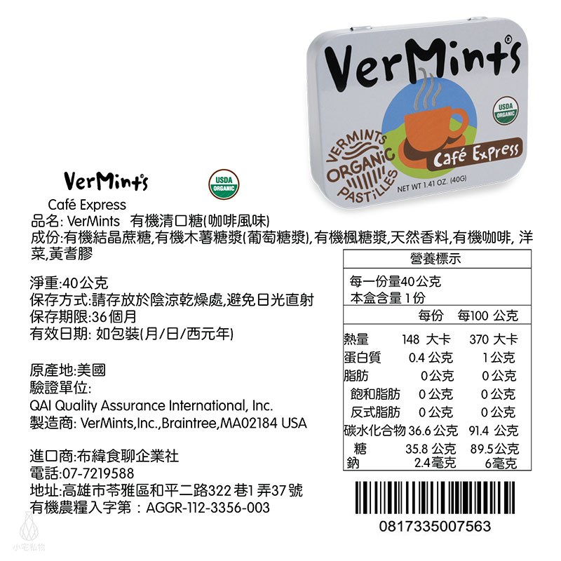 - 品 名:美國 Organic VerMints 有機薄荷糖 40g