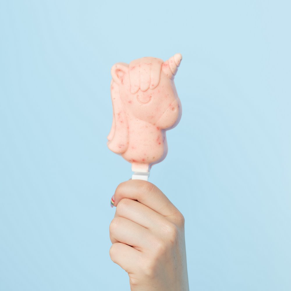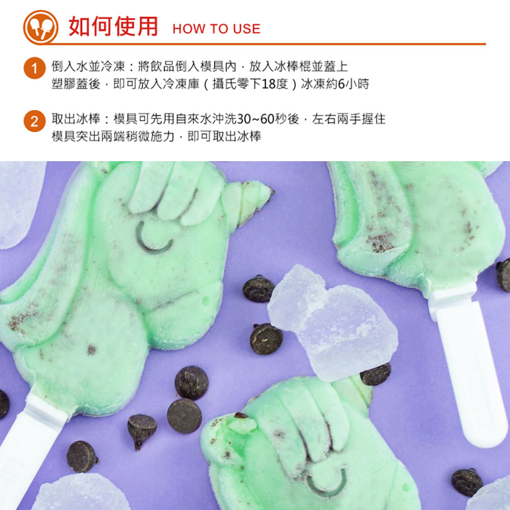 造型俏皮可愛又吸睛,享受自製健康衛生冰品的樂趣。將攪打好的果汁、果泥倒入模具內 (建議盛裝 8~9 分滿即可),再將冰棒棍放入並蓋上塑膠蓋,放入冷凍庫,約6 小時後取出。模具可先用自來水沖洗30~60秒後,左右兩手握住模具突出兩端稍微施力,即可取出冰棒。