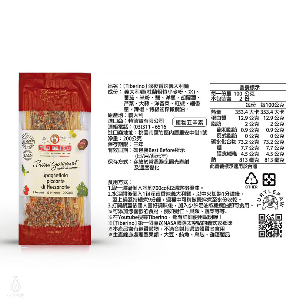 | 品名: | 【Tiberino】義大利深夜香辣義大利麵(200克) |
