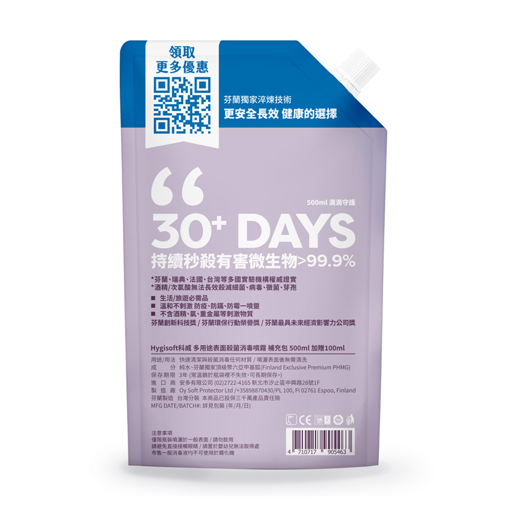 - 內 容 物:芬蘭 Hygisoft 科威 多用途表面殺菌消毒噴霧 600ml 補充袋