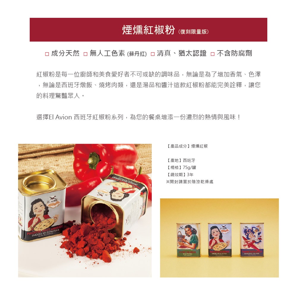 - 品 名:西班牙 El Avion 香料航家煙燻紅椒粉 (復刻限量版) 75g