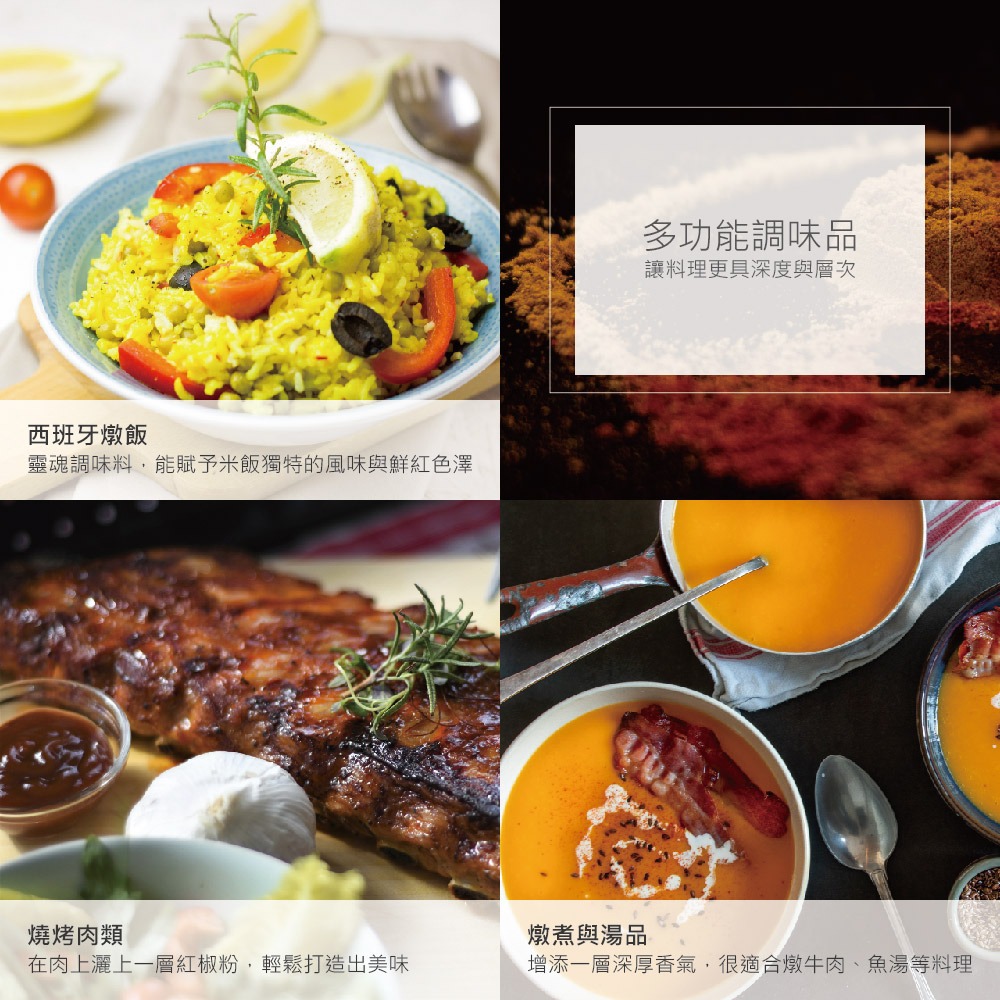 除了擁有紅椒本身的辛辣,還散發出迷人的煙燻氣息,可以用來烹調西班牙海鮮飯、燉菜、燉飯及煙燻香腸。