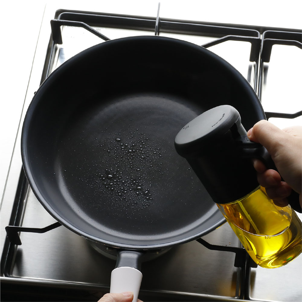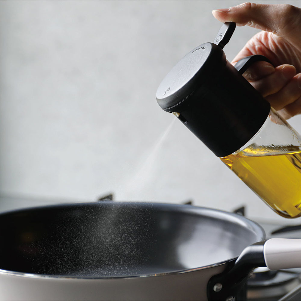 只需輕輕一按的「耐熱玻璃按壓式噴油罐」,一按即可噴出約 0.5ml 的油量,即使少量也能夠有良好的包覆效果,減少烹調時的浪費與不均。不僅能夠避免使用過多的油,還能達到省時又健康的料理效果。