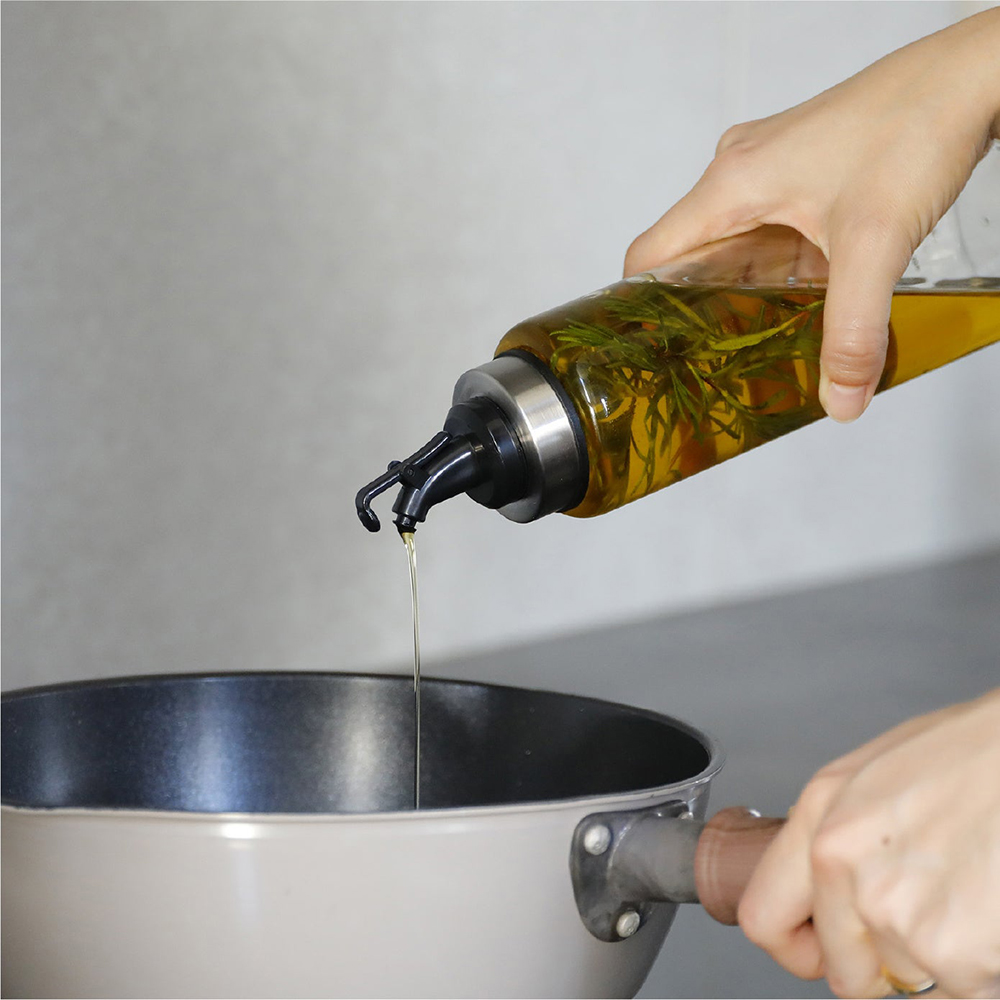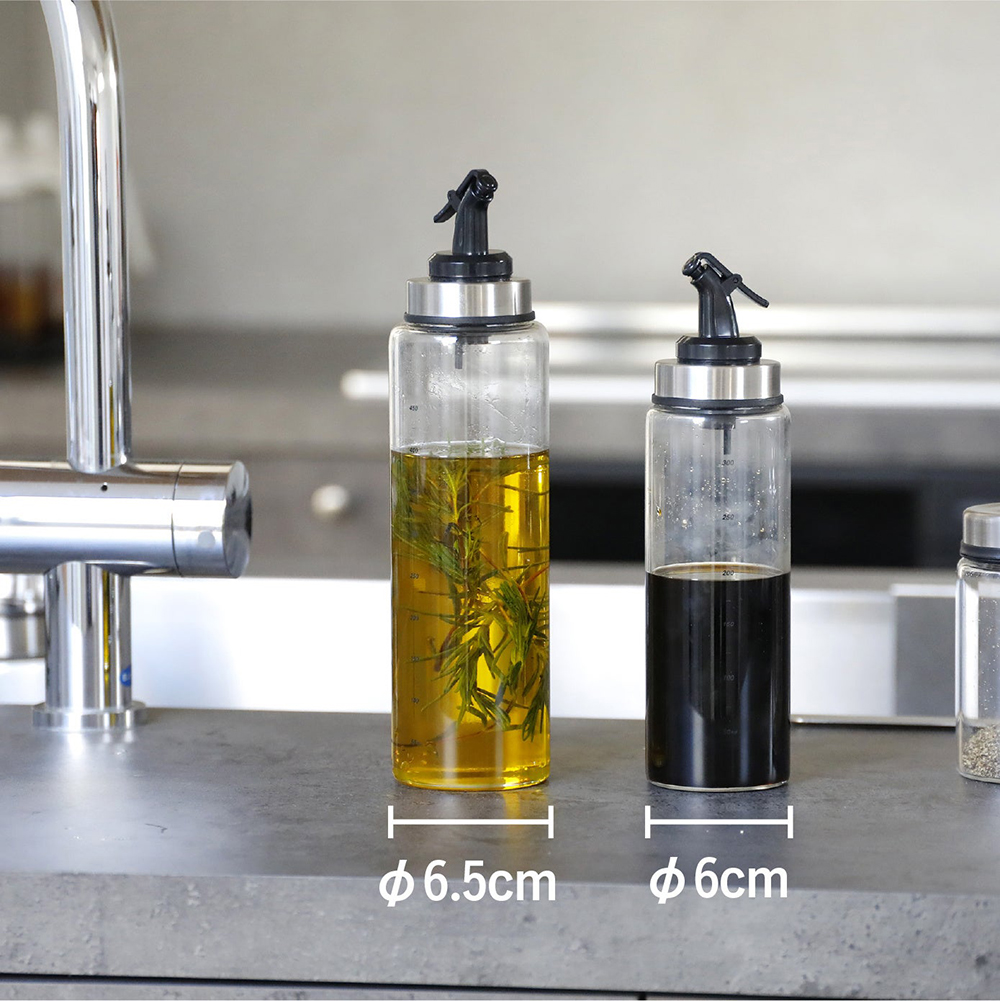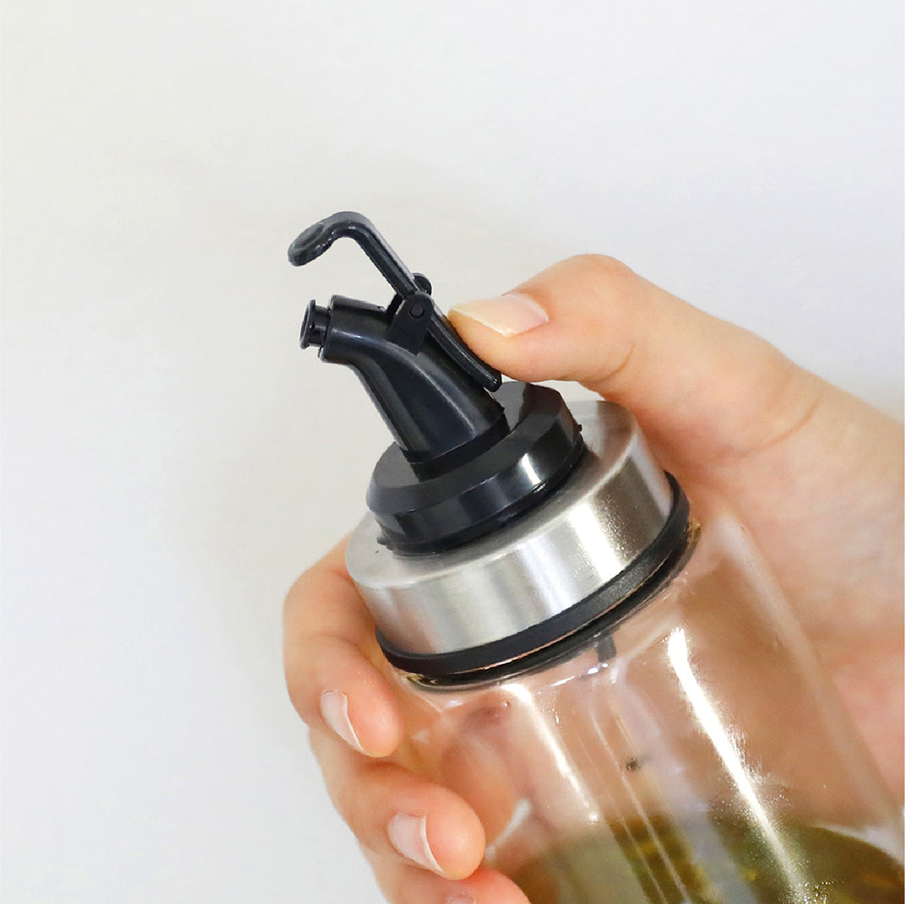 單手即可開關的「耐熱玻璃按壓式油罐L」,注口纖細可以輕鬆控制出油量,本體由耐酸且不易有異味殘留的玻璃製成,可清楚確認內容物剩餘容量。