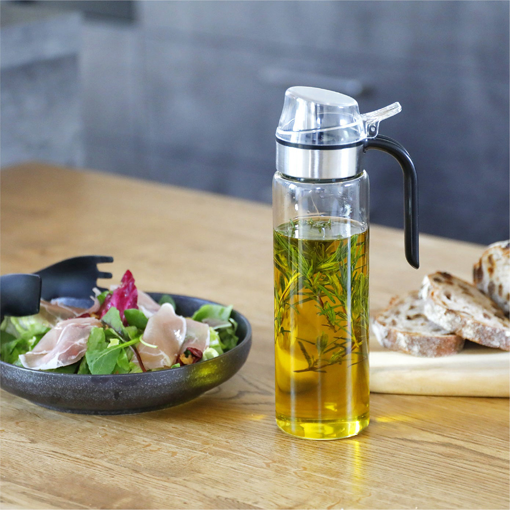 輕輕按押上蓋即可輕鬆倒出油的「耐熱防回流玻璃油罐」,本體由耐酸且不易有異味殘留的玻璃製成,可清楚確認內容物剩餘容量。