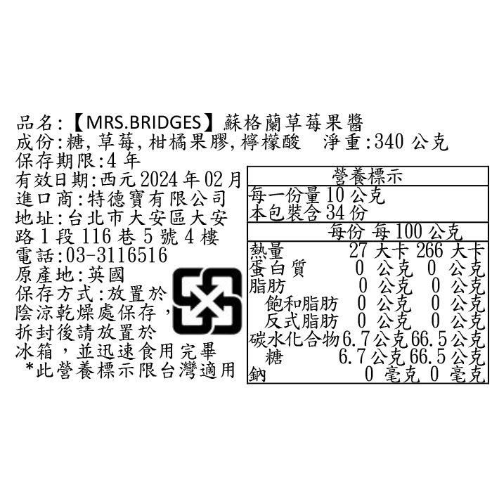 | 品名: | 【MRS. BRIDGES】英橋夫人蘇格蘭草莓果醬(大)340g |