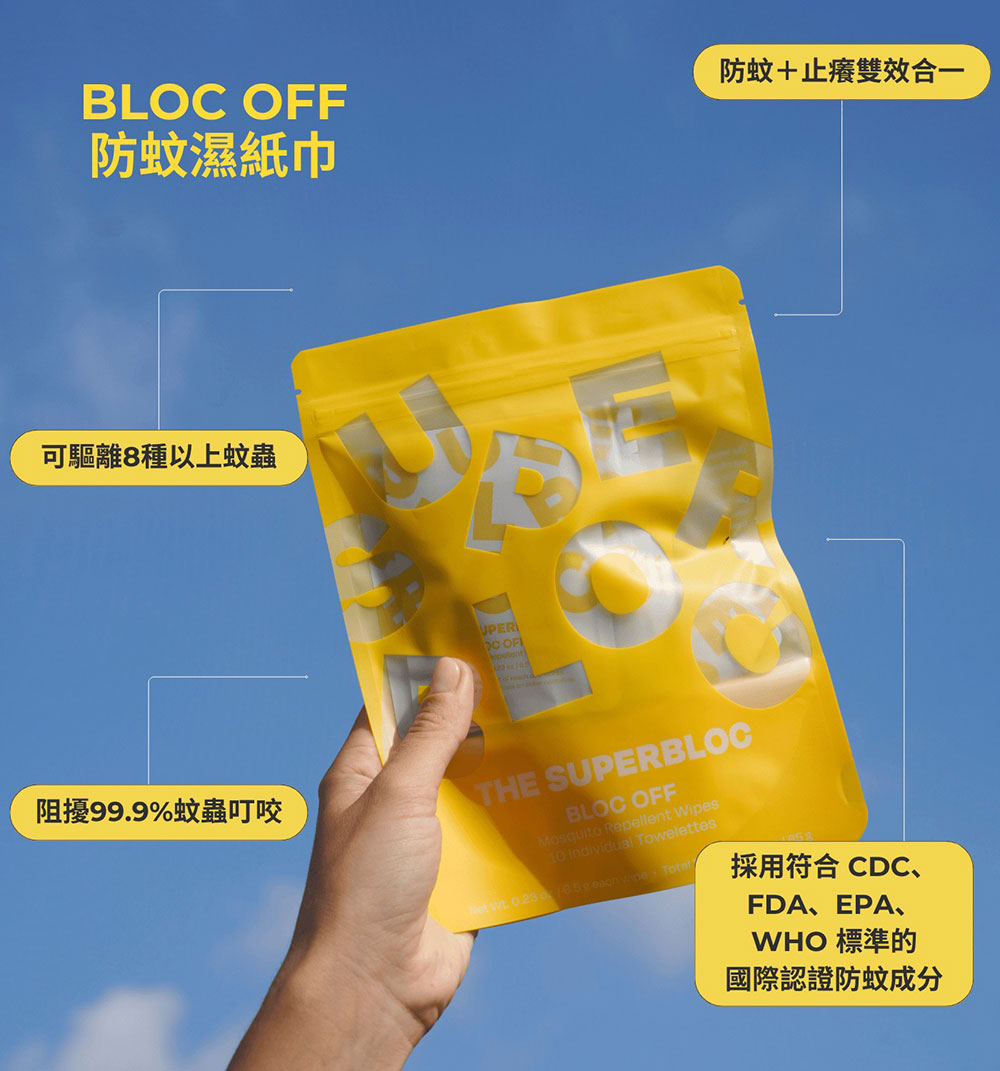 最熱銷的 Bloc Off 防蚊系列推出濕紙巾更方便日常攜帶!The Superbloc 植萃保濕配方的天然防蚊噴霧,不含酒精、避蚊胺,適合日常室內及戶外使用。 這款濕紙巾含有效的天然成分,具防蚊效果配方。Superbloc 獨特的配方不僅能減少蚊蟲干擾,舒緩肌膚不適。這款香氛物的前調是檸檬和尤加利和,尾調是松樹和雪松木。